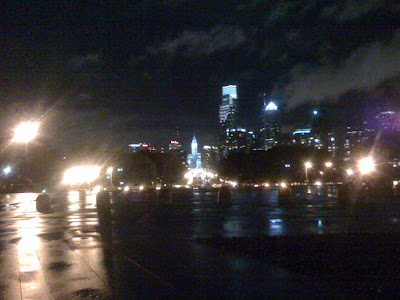 So I set off at 9:30 at night, through Philadelphia, towards the art museum. Fortunately for me, the rain stopped while I walked, but that didn't do anything for drying off the steps up to the museum. I got there, took a deep breath, and took off up the steps. Once I got to the top, I turned around and took a picture of City Hall from the top of the steps.