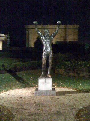 The last goal, though, was a test of my desire to follow through. Running up the steps of the art museum like Rocky seemed to be a common goal among the people I traveled with. The trouble was that we all had different times we wanted to do it. I kept putting mine off for various reasons, but the final day of the trip came and a tropical storm brought rain all day. And all day, I was at the conference. As soon as the conference ended, we went to dinner. The rain kept falling, making me wonder just how badly I wanted to run up the now-wet steps of the museum. I mapped it out and decided to walk, since it was only almost 2 miles away and I'm too cheap to take a taxi for 2 miles.